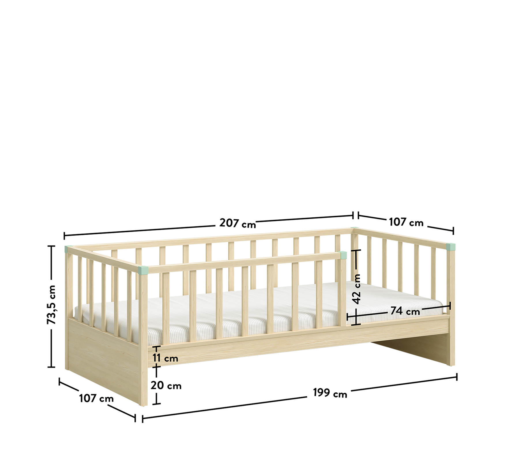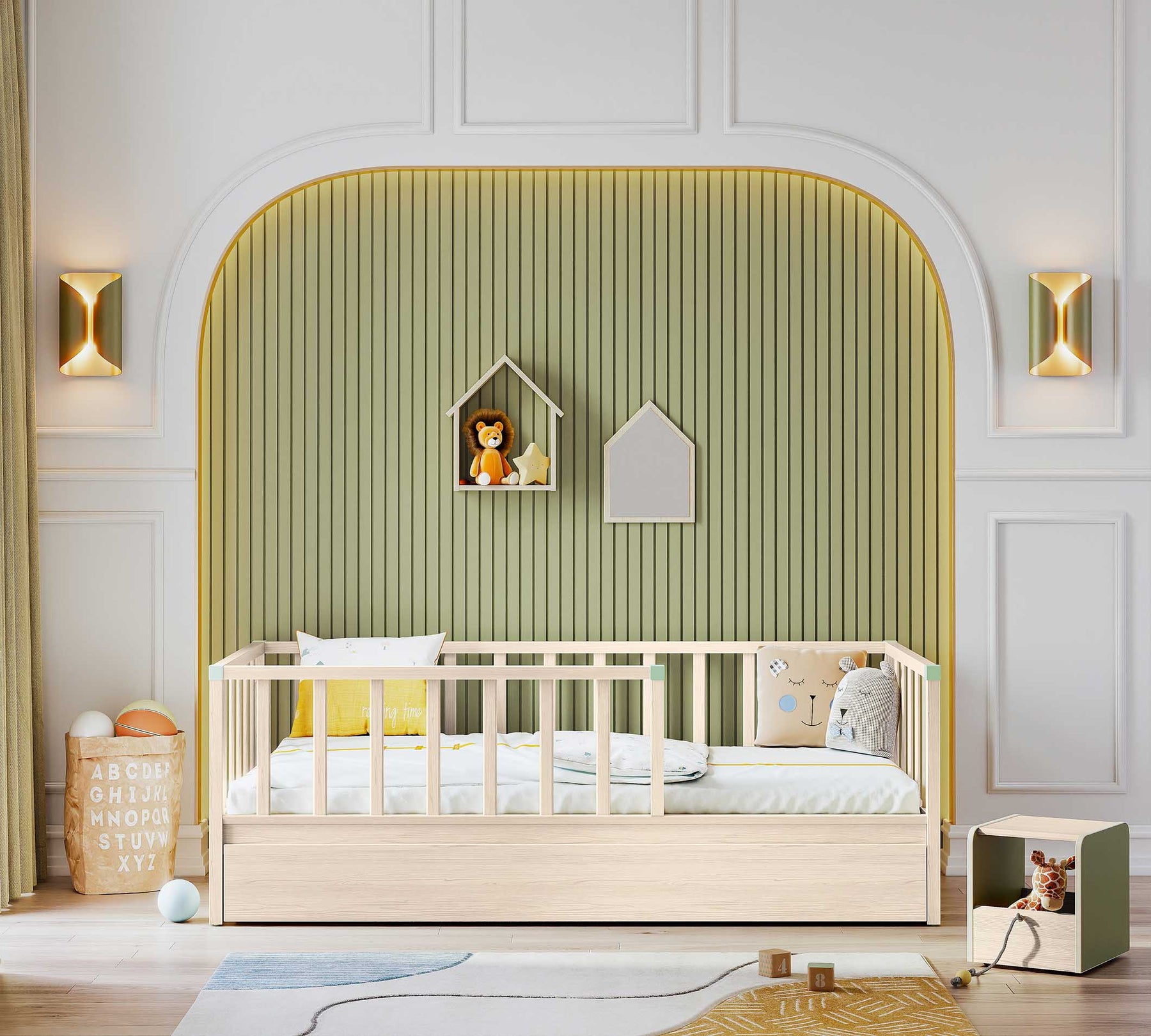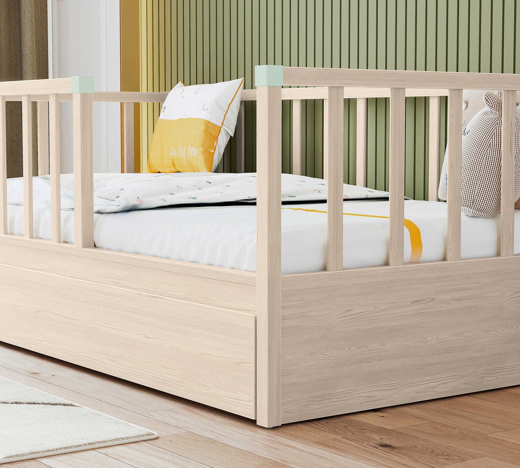 3 tarafında bulunan korkuluklar, yerden yüksek tasarımları ile güvenli olarak uyumaları hedeflenmiştir. İstenirse tek alınabilen karyola istenirse ek alınabilecek alt karyola seçeneği ile çocuğunuz büyürken ikinci bir uyku alanı ya da ideal bir depolama alanını da beraberinde getirmektedir.