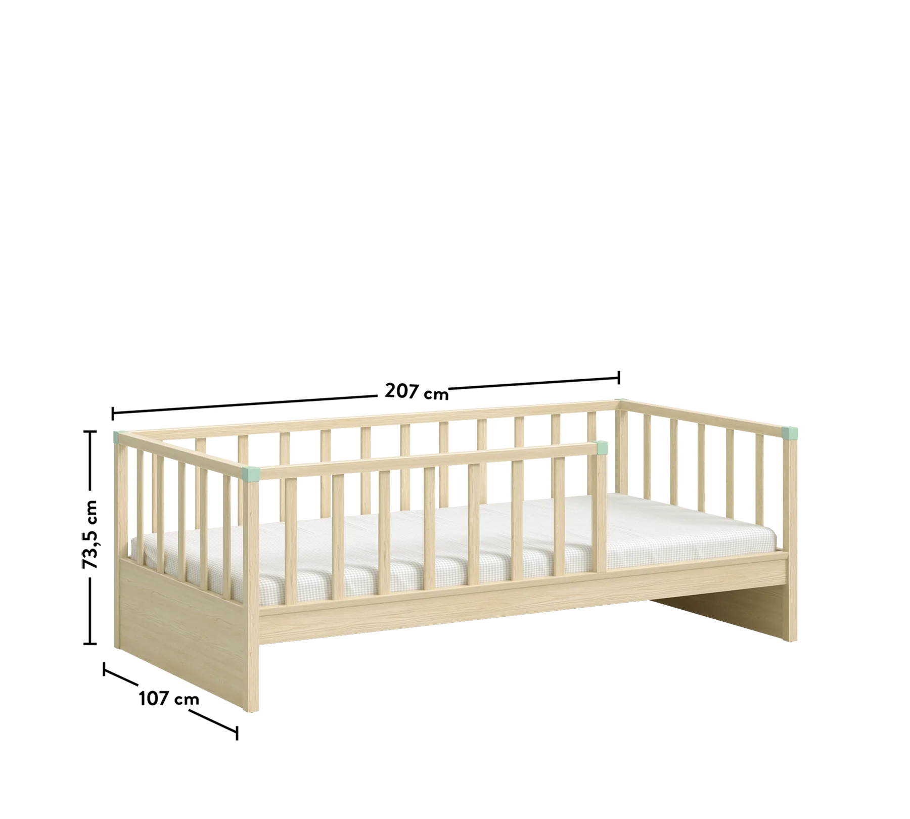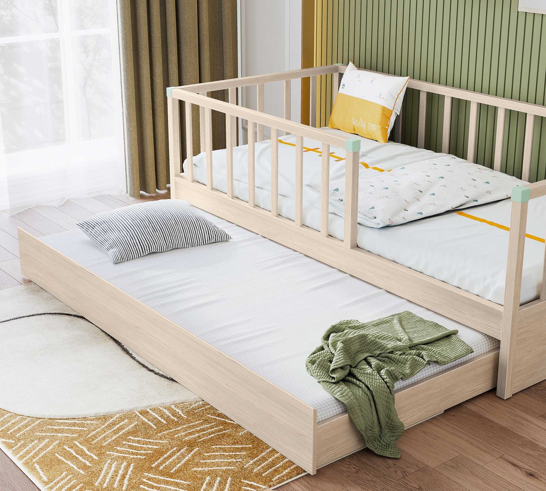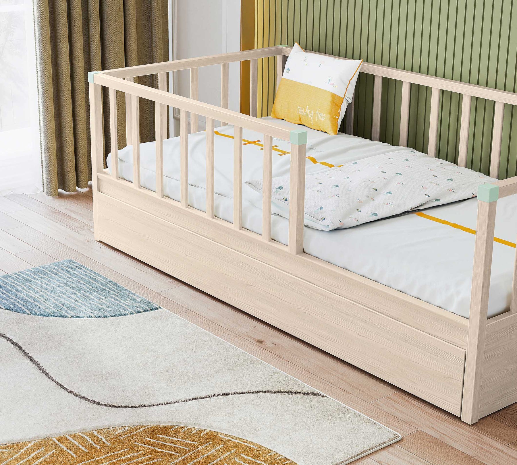 3 tarafında bulunan korkuluklar, yerden yüksek tasarımları ile güvenli olarak uyumaları hedeflenmiştir. İstenirse tek alınabilen karyola istenirse ek alınabilecek alt karyola seçeneği ile çocuğunuz büyürken ikinci bir uyku alanı ya da ideal bir depolama alanını da beraberinde getirmektedir.
