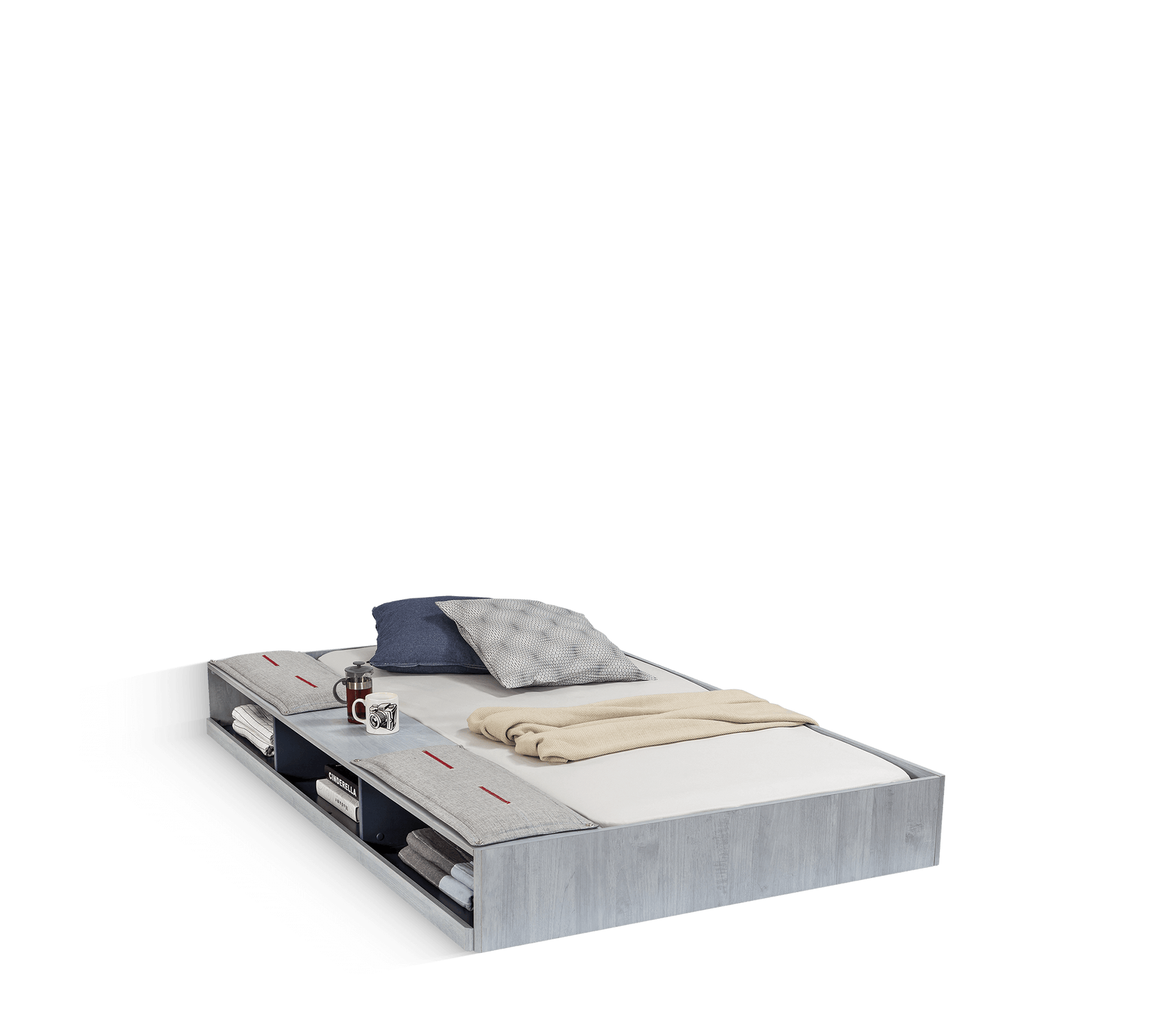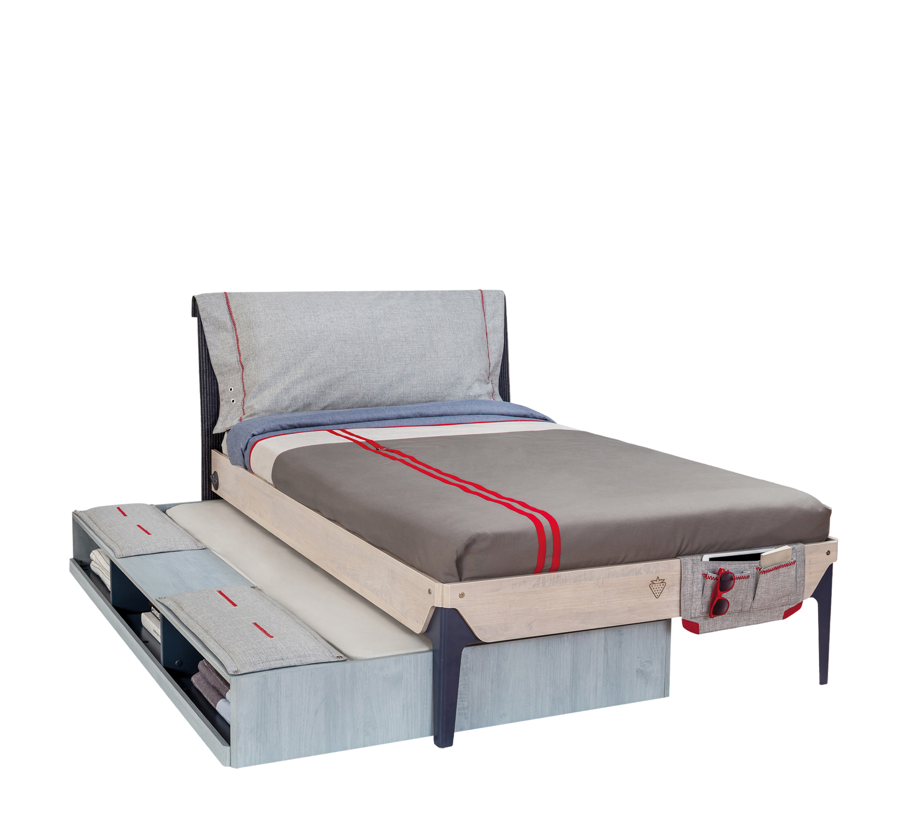 Ndarja në anë mbetet jashtë kur shtrati i poshtëm shtyhet nën krevat dhe përdoret për të organizuar sendet personale. Kursimi i hapësirës për hapësira të ngushta, krevati me fund seksional Trio shton rehati dhe thjeshtësi në dhomat e të rinjve.