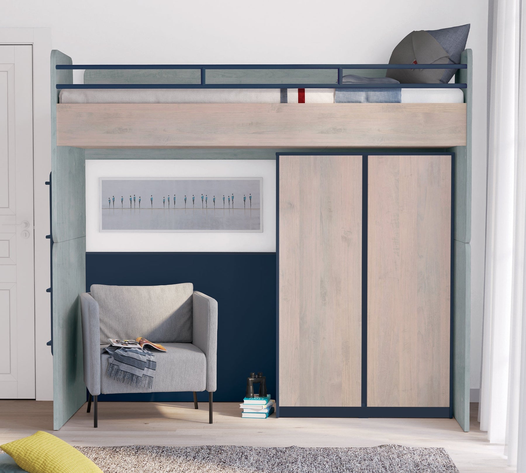 Trio Stüdyo Alt Kasa me do të krijoni një zgjidhje komplekse në dhomën tuaj; duke përfshirë një tavolinë pune, garderobë dhe krevat.